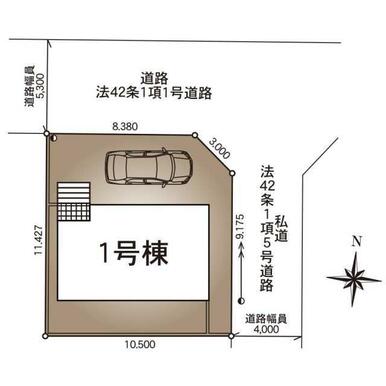 | 用途地域 | 1種低層 | 接道状況 | 北5.3m 公道 接面8.3m 東4.0m 私道 接面9.1m 位置指定あり |